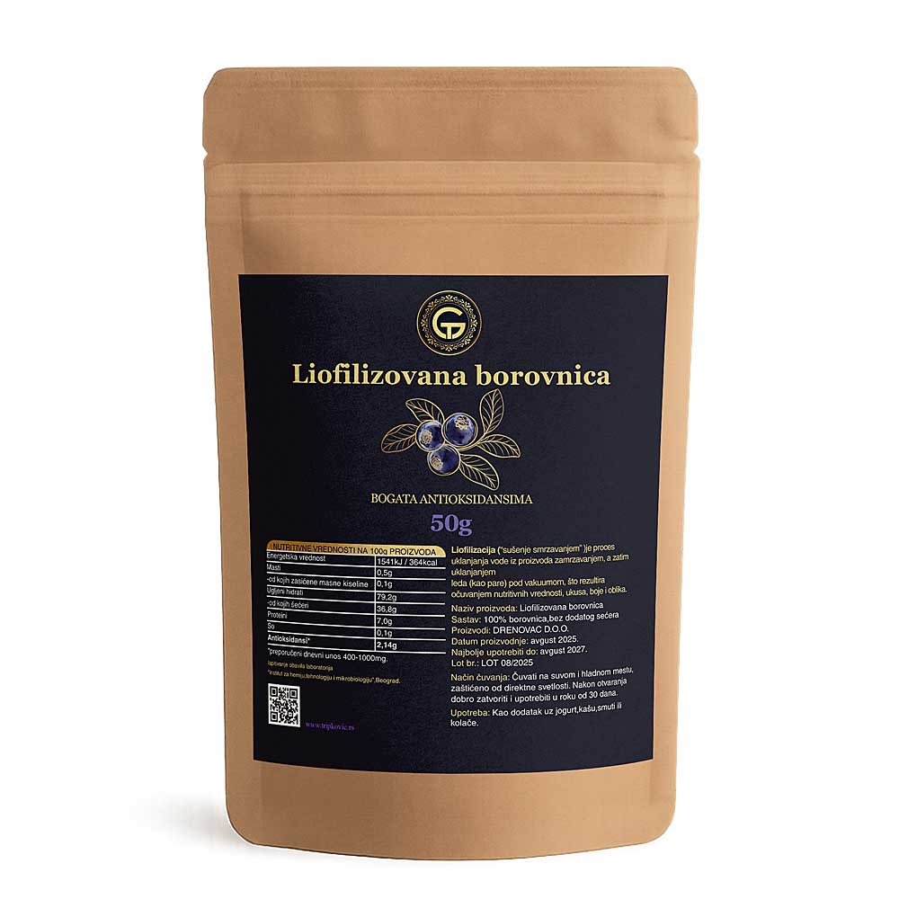 Za razliku od klasičnog sušenja, liofilizacija omogućava da se voće zamrzne na vrlo niskim temperaturama, a zatim dehidrira tako da voda ispari, dok hranljive materije ostaju netaknute. Ovaj napredni proces čuva do 95% nutritivne vrednosti sveže borovnice, kao i njen prepoznatljiv miris i boju. Zato su liofilizovane borovnice ne samo ukusne već i izuzetno bogate hranljivim sastojcima.